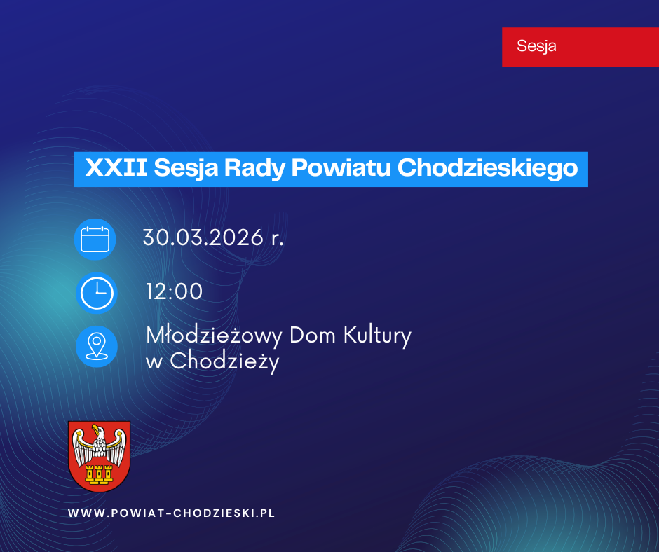 XXII Sesja Rady Powiatu Chodzieskiego odbędzie się w dniu 30 marca 2026 r., o godz. 12:00 w Młodzieżowym Domu Kultury im. Janusza Korczaka w Chodzieży.