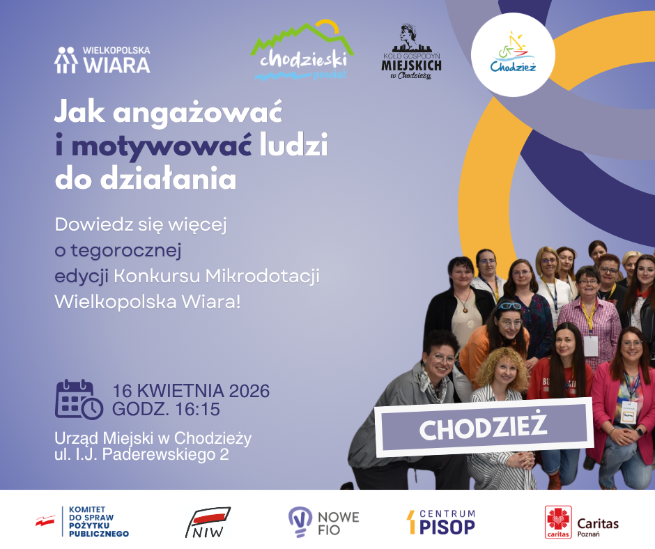 Zapraszamy liderów, członków NGO i inne zainteresowane osoby na spotkanie informacyjne dotyczące ogłoszonego konkursu „Wielkopolska Wiara”, organizowanego przez Stowarzyszenie Centrum PISOP. To doskonała okazja, aby dowiedzieć się, jak przygotować wniosek i zdobyć dofinansowanie na działania społeczne. a także w jaki sposób motywować i angażować do działania.