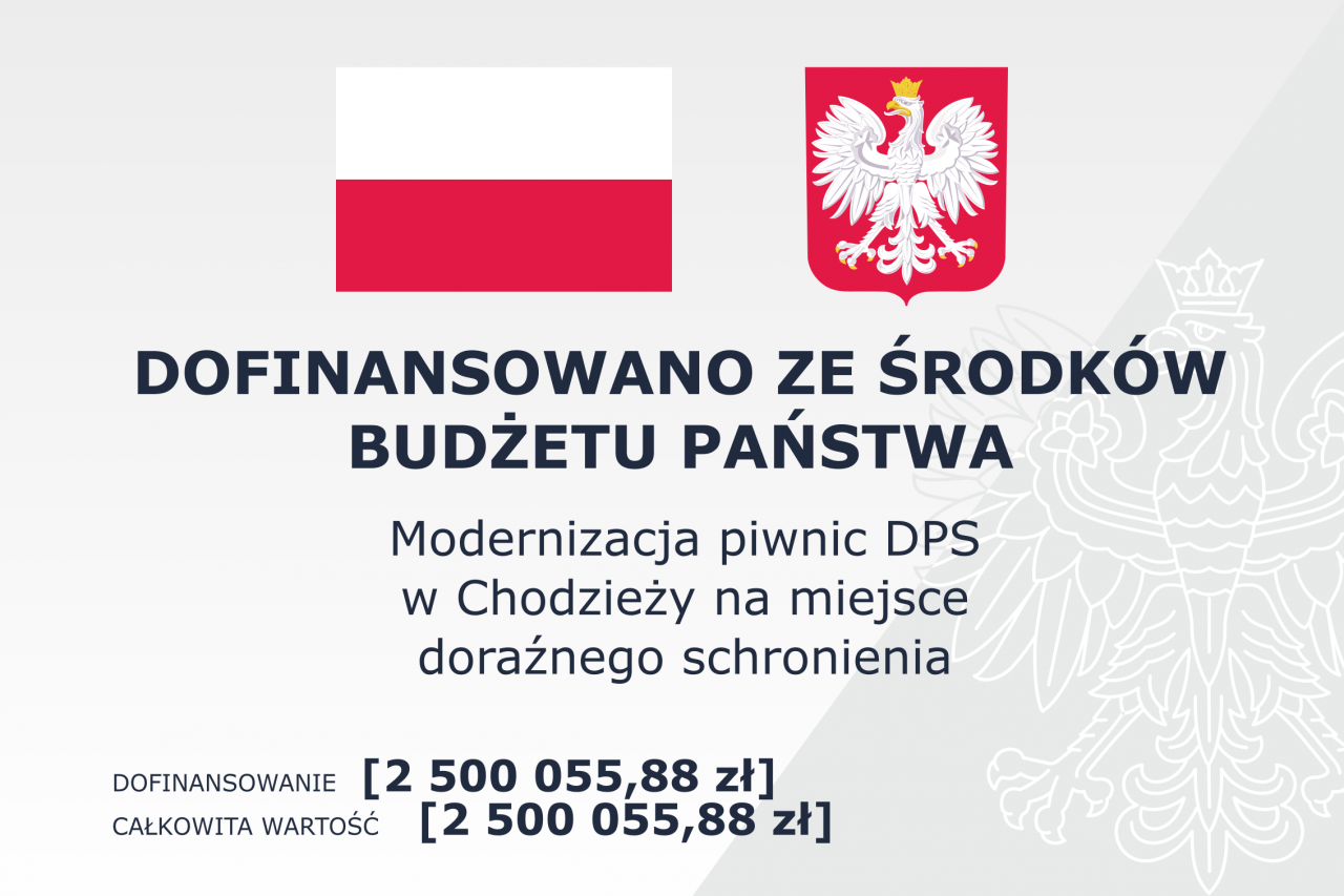 Celem projektu jest modernizacja i przebudowa piwnic budynku Domu Pomocy Społecznej w Chodzieży wraz z termomodernizacją i izolacją przeciwwilgociową magazynu, który się tam znajduje. Pomieszczenia zostaną dostosowane do warunków miejsca doraźnego schronienia – MDS z przeznaczeniem dla 200 osób, głównie dla mieszkańców i pracowników DPS, a także w momencie wolnych miejsc dla mieszkańców miasta Chodzieży i/lub powiatu chodzieskiego. Dzięki utworzeniu miejsc schronienia, w sytuacji zagrożenia, nie będzie konieczności transportowania w/w osób, głównie niepełnosprawnych, w inne miejsce.